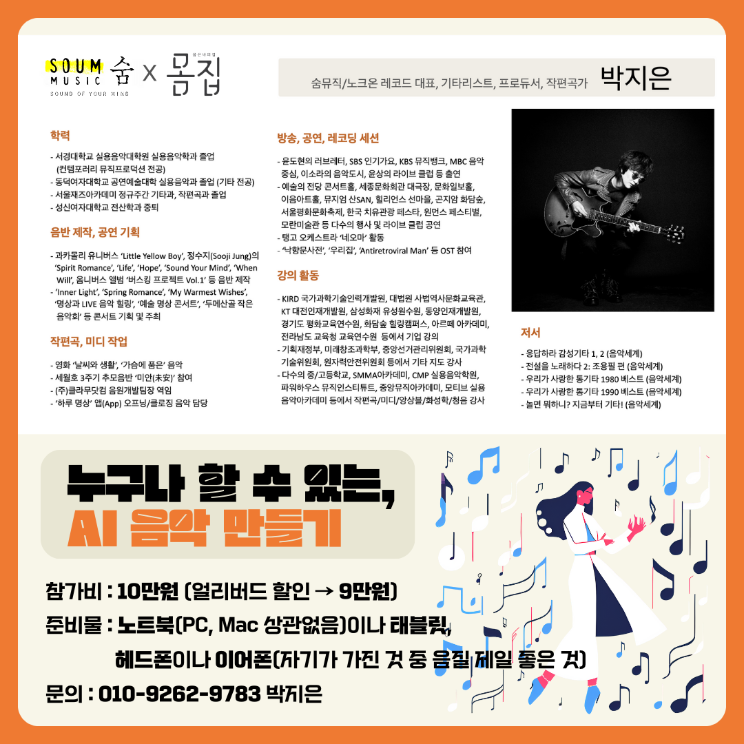 숨뮤직과 몸집이 함께 여는 <누구나 할 수 있는, AI 음악 만들기> 스페셜 워크숍에 오시면,