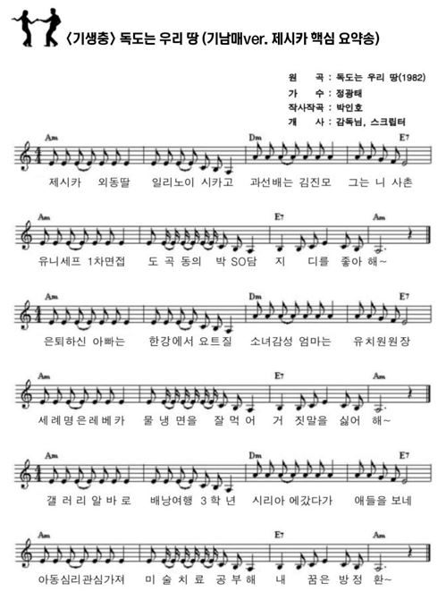 마침 원고 중에 '독도는 우리땅'이 있어서 기생충 4관왕 기념으로 '제시카 송'으로 바꿔보았습니다.